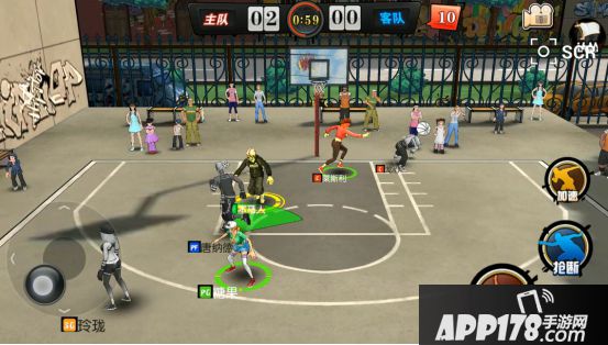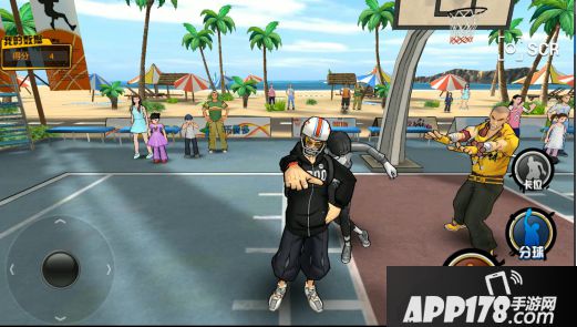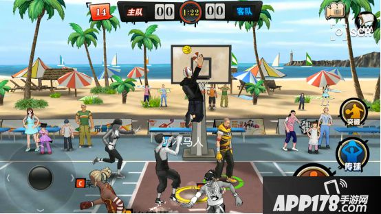 《街篮》的操作比较容易上手,游戏以虚拟摇杆式操作为主,屏幕左下方的摇杆控制人物移动,右下方的虚拟按键则可以完成进攻、释放进攻技能等动作。在非持球时间,你的技能全是防守技能;若在持球时间内,你的技能全是进攻技能。