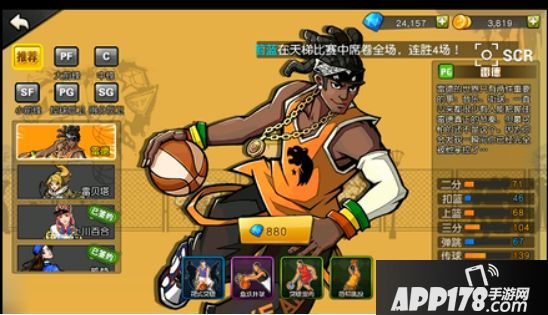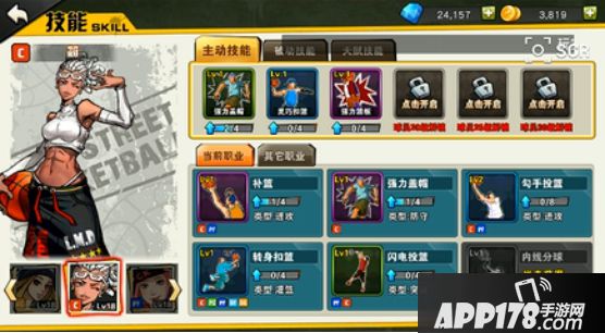 投篮、传球、篮板,抢断为初始技能,右上边第三个技能会根据你所在打位置配对不同技能,如小前锋的位置,第三个技能配置为突破,中锋的第三个技能配置为背身。
