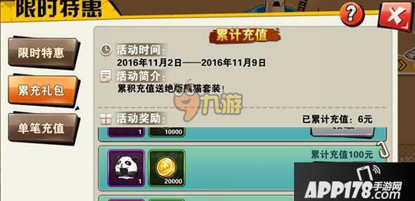 累积充值188元就能在“特惠”的累计充值礼包中领取整套的熊猫套装。