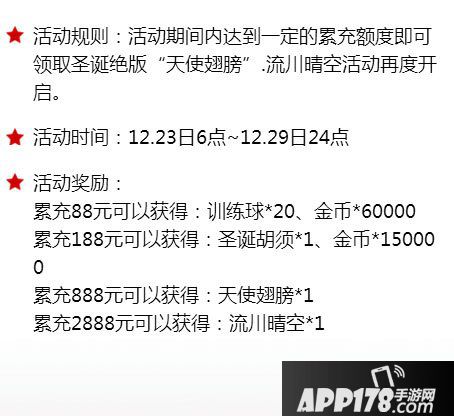 于12月23日正式上线得圣诞充值活动中,累计重置888元即可获得天使之翼。活动时间持续一周。