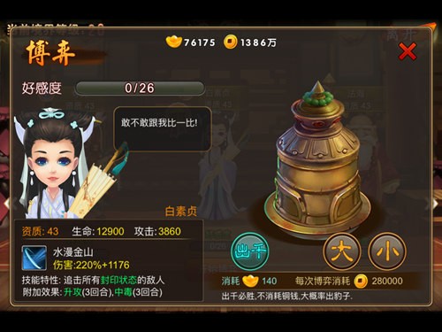 接下来就是白素贞,白蛇传的女主,一招水漫金山淹死多少平民百姓,可见其伤害值,所以其攻击力会偏高。虽然与法海势不两立,但在《囧西游》中两人却是绝配,“水漫金山”的技能会追击所有的封印状态敌人,并附加3回合的升攻和中毒,让被封印的敌人受到更多的伤害,结合法海甚至可以秒杀一个后排输出。
