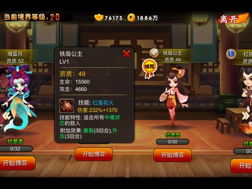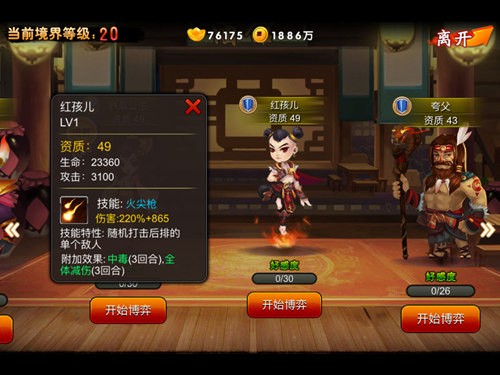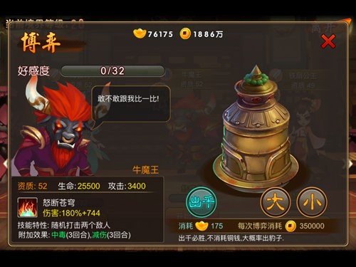 牛魔王是红孩儿的老爸,自然在各种属性上都有明显的提升,技能也是有所强化。“怒断苍穹”能够随机打击两个敌人,并附带中毒、减伤3个回合。该技能也是红孩儿的进阶版,两个敌人的效果就显得更有作用,而中毒的效果也是让接下来的伙伴联携技能有了更大的发挥空间。这位伙伴就是接下来要介绍的铁扇公主。