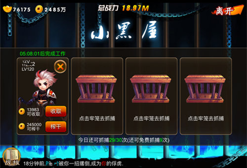 在《囧西游》中,小黑屋也是PVP的一大玩法,通过点击玩家的头像,然后选择合适的对手,与他们进行对战。如果对手的战力远超过于你,可以再次刷新对手,直到自己满意为止。每天玩家有多次挑战的机会,并有10次可以免费抓捕的时机。在挑战胜利后就可以直接让该玩家成为你的奴隶,来赚取铜钱,或是直接榨干其价值,获得大量的铜钱奖励。如若之前被抓过,则会成为仇敌,玩家可以随时记住这些对手,等来日战力提升可再次挑战。