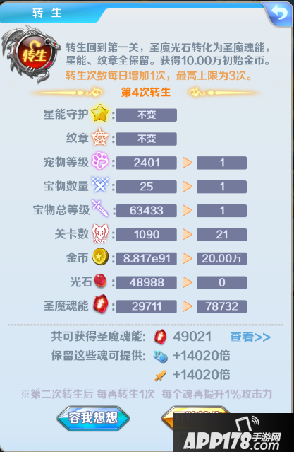 (上图之中,光石积攒了4000多,是非常好的转生时机!后期的主要玩法就是积攒大量光石后,在转生之前将圣魔魂能用于升级纹章)同时满足以下两个条件即可进行转生: