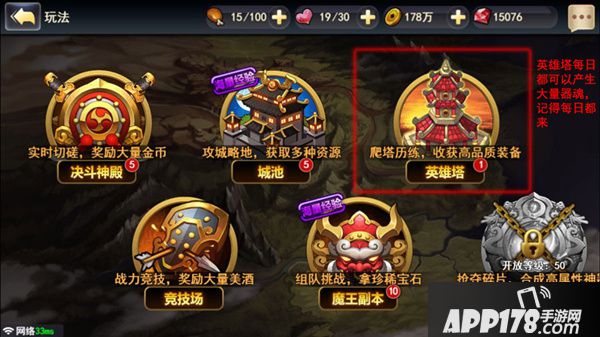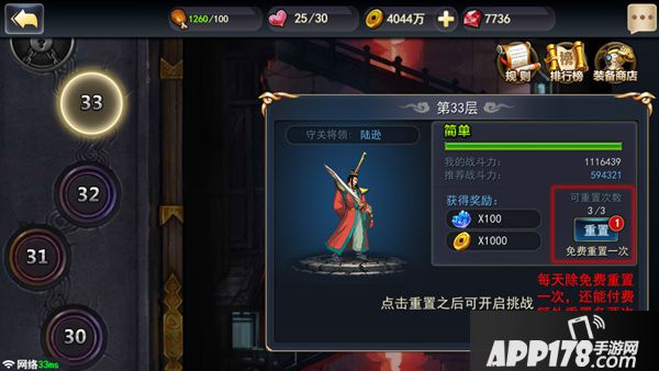 英雄塔总共有100层,而当主公感觉闯关途中有事离开,或者发挥不足,战力吃紧的时候,都可以按左边的暂停键,离开游戏,等强化战力之后再来继续挑战。即使硬闯失败了也没关系,英雄塔每天都会有一次重置机会。