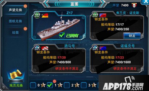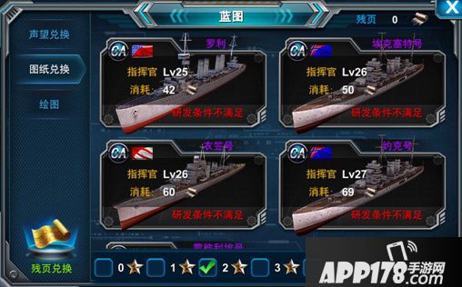 图纸兑换需要消耗一定数量的战舰图纸,并且指挥官的等级达到要求等级,就可以研发战舰。战舰越高级所需要的战舰图纸越高级,数量也越多,且角色等级要求也越高,但研发出来的战舰其战斗力也越强。