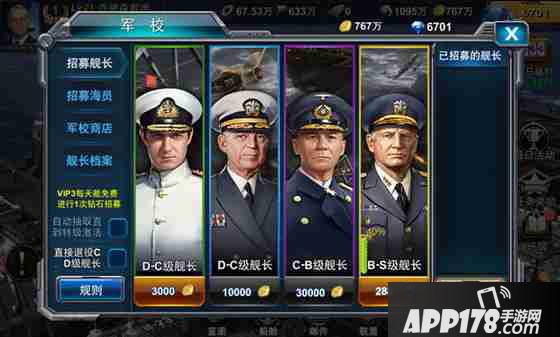 六、招募舰长及海员。当玩家积累了一定的钻石后,我们可以在军校系统中,使用钻石来招募更高级的舰长及海员,加以培养,可以极大的提升我们舰队的战力。