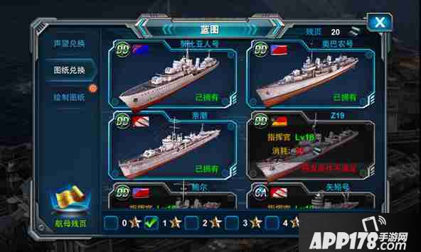 五、蓝图。在蓝图系统中,通过声望兑换、图纸兑换及绘制图纸来研发建造更高星级的战舰,只要达到相关的研发条件就尽可能的研发建造更高级的战舰,上阵更高级的战舰,也能提升舰队的战力。