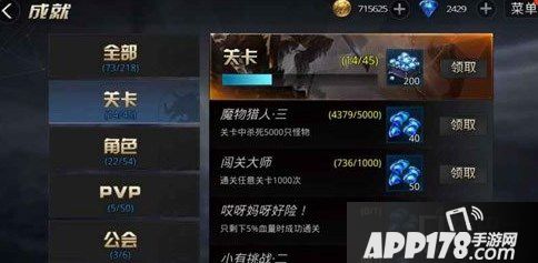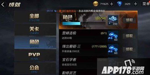 关卡和角色:主要的就是玩家们在刷副本的过程中击杀的怪物和一些闯关的次数,其中还包括一些过关关卡的难度,二角色就是我们职业的等级、转职次数、战力、装备的洗练淬炼等等,总共是有54个自成就,当我们全部完成之后还有额外的钻石奖励。