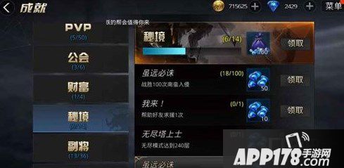 成就玩法:首先目前在游戏中我们可以获得成就数量最大是218,主要分为关卡、角色、PVP、公会、财富、秘境、副将、社交8大部分,每个部分都是各自的子成就的,每个成就给我们带来的钻石收益也是不一样的。