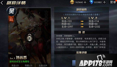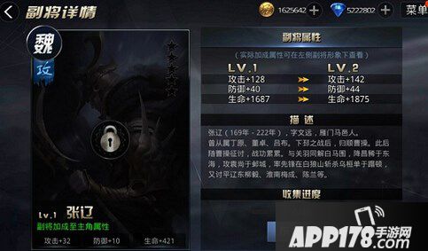 2)初始副将属性为128攻击,40防御,1687生命值,每升一级增加攻击14点,防御4点,生命188点。