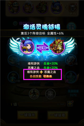 合理搭配英雄往往能够虐杀等战力对手甚至反杀高战力,因此新手上路有一个趁手的阵容能让进阶之路顺畅不少。首先需要考虑的是元素相克,游戏中遵循风→地→水→火→风,相互克制的元素属性规则。推图打怪尽量上阵不同元素的英雄,PK则根据对方阵容调配,获得一定优势。此外上阵含有灵魂链接及能激活合战技能的英雄能够使利益最大化!