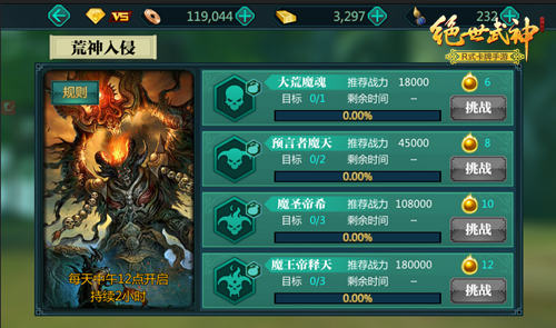 每日入侵的荒神分别是:大荒魔魂,每次挑战消耗英雄6点体力;预言者魔天,每次挑战消耗英雄8点体力;魔圣帝希,每次挑战消耗英雄10点体力;魔王帝释天,每次挑战消耗英雄12点体力。玩家只要达到挑战要求,即可向对应荒神发起挑战,挑战成功可获取奖励,难度越高奖励越丰富。