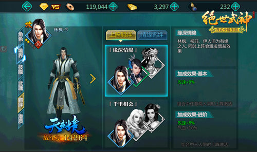 以男主林枫为例,林枫的“缘深情绵”的阵容为林枫&柳菲&伊人泪,当林枫和柳菲共同出站时,团队即可获得攻速增加8%的附加属性;当三人同时上阵是,团队成员的气血还将额外增加10%。