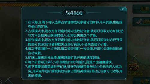小编提醒:当决定占领矿脉后,则需要至少一名英雄前来护矿,护矿的英雄可以参加掠夺却不能再次进入练功房或守护其他矿脉。占领矿脉尽管开心,但却要小心其他玩家“以其人之道,还治其人之身”,所以占矿有风险,定要遣强力英雄前来征战!