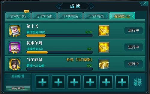 《绝世武神》成就系统主要分为五部分,武神之路、无尽挑战、千锤百炼、江湖百态和紫陌红尘,下面就分别来介绍一下这五个部分所包含的成就类型。