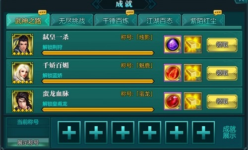 《绝世武神》中的成就多种多样,包含了你的成长过程、日常任务、社会活动、互动交友、荣耀获得等等,几乎囊括了你在游戏中所有可能的行为,你在完成这些行为时,还将获得金锭、铜币等奖励,并且在《绝世武神》里完成指定成就还可以获得专属称号!