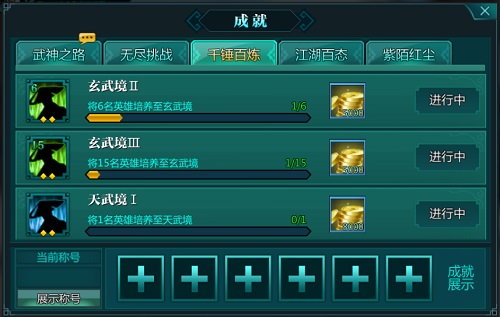 千锤百炼:武修之路非一马平川,需千锤百炼。意如其名,在千锤百炼中,多是以英雄升级、提升英雄武境等相关,例如提高英雄武境至玄武境、天武境等等,在这个类别下,奖励同样以铜币为主。
