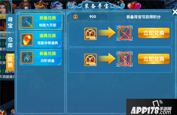 兑换:在这里用寻宝积分进行装备与道具兑换,兑换积分通过用元宝寻宝获得,每一次用元宝寻宝都能获得相应的寻宝积分