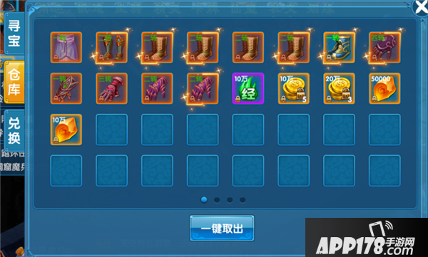 仓库:你寻宝到的物品都会先放着仓库,你可以选择性取出一部分,也可以一键取出全部物品