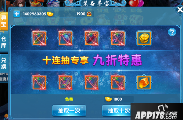 寻宝:这这个界面用元宝进行单次寻宝或者十连抽寻宝,每天都有一次免费的单次寻宝的机会,除了能抽出装备之外,还能抽出铜币、娲石跟经验。