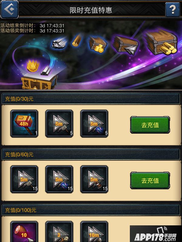 1、累计充值¥30:48小时建造队列*1 ; 5分钟建筑加速*5 ; 5分钟科技加速*5