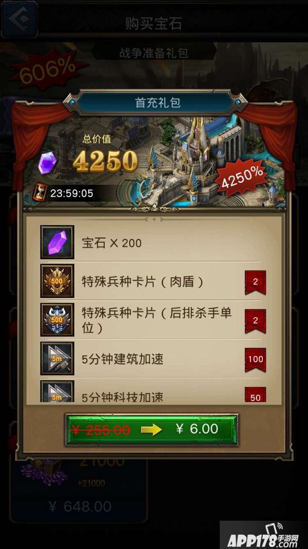3.点击之后你可以看见礼包有哪些内容,其中最上面的第二和第三排列道具就是“兵种卡”,此卡功能则是让你直接拥有一些高等级的兵种(让你瞬间变霸主!)。