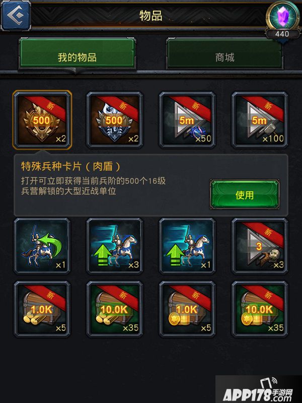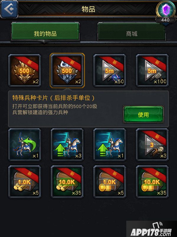 4.高等级兵种是怎么样的呢?购买之后你就打开你的背包,你会发现有2个比较特殊的道具,对这就是“兵种卡”,道具使用之后会让你拥有1000个16级兵营解锁的大型近战兵种,1000个20级兵营解锁建造的强力兵种。(2张兵种卡都使用完)