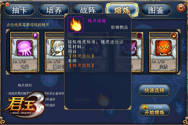 精灵面板是《君王》最重要的系统之一,玩家们每天可以通过各种方式获得一大波萌萌哒的小精灵,可玩家们都知道低等级的小精灵虽然可爱但其实并没什么卵用的!而全新的精灵炼化系统就是为了安置这么一群闲置的小精灵而存在滴!只要将小精灵放入熔炼炉,奇迹就发生咯,精灵幻化成“精灵精魄”浴火重生!
