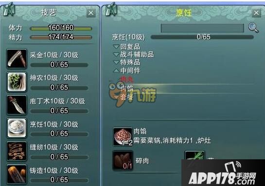 按I键打开技艺界面后点击烹饪图标,弹出如下烹饪界面: