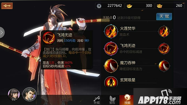 第二个技能【飞鸿无迹】:飞鸿属于主动攻击技能【独门】纵马扬鞭,向前冲撞,攻击直线沿途目标。每命中一个目标减少3秒技能CD。攻击1次,伤害360%目标5秒内减速50%