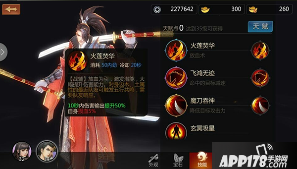 第一个技能【火莲焚华】:火莲属于辅助技能。【战辅】放血为引,激发潜能,大幅提升伤害能力。对身边木,土属性的最近队友可触发五行共鸣;需要队友响应。10秒内伤害输出提升50%自身损血5%!