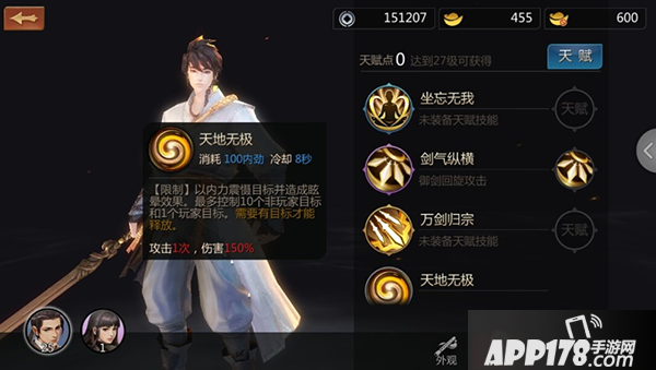 天地无极:以内力震慑目标并造成眩晕效果。最多控制10个非玩家和1个玩家目标。这技能简直是单挑必备,什么都不说,关键时刻,直接翻盘必备。