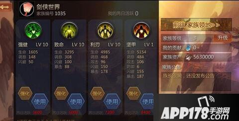 同时,家族族长也可以强化家族技能!每次每条属性都强化一次后,技能整体的等级才会增加,当一个技能满级后机会开启下一个技能,每个家族的技能都是4种,分为:强健、致命、利刃、坚甲;每个技能满级为10级!根据需要“使用”的技能不同,所需兑换的两日活跃数也不同,活跃表示大侠这两日的贡献值!