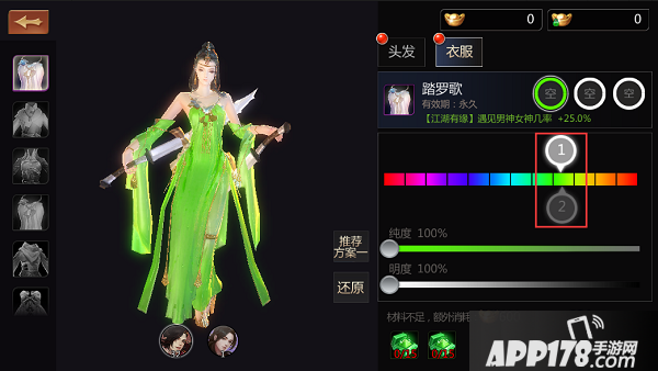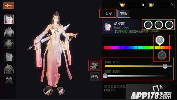 如上图所示,在拖动①,②时,可以对衣服,裤子的颜色进行自定义的设置,纯度越高,颜色越鲜艳,纯度越低颜色越不明显,如果纯度为0%,随意拖动颜色,都不会改动时装的颜色。