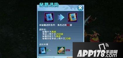 高级秘籍通过消耗修为提升等级,升级时会提升秘籍属性点。每当秘籍等级升到160、170、180、190、200级时,必定会提升一级附带技能等级。