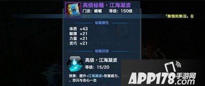 15级的技能效果提高30%基础攻击、10%造成迟缓的几率、0点忽视闪避与0点会心一击。相比中级秘籍增加了忽视闪避和会心几率。技能<江海凝波>向目标方向推出一道波浪,对碰到的敌人造成多次伤害,同时有几率附带迟缓效果。是可以说是峨眉的主要输出手段之一,面伤加控制和多次伤害,唯一缺点就是比较难打到人。在能准备打到人的情况下,输出还是比较可观的。高级秘籍又增加了忽视闪避和会心几率相比以前增加了<江海凝波>的技能伤害。一定程度上弥补了峨眉伤害的不足,<江海凝波>连续3次波浪的输出还是很可观的。