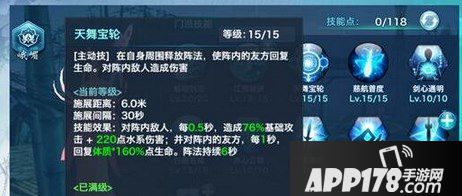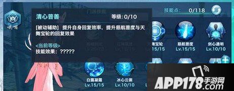 动技能<剑心通明>永久提升基础攻击力、基础生命上限、移动速度;<冰心云裳>永久提升自身200点抗会心几率和30%会心免伤;<剑法进阶>提升[峨眉剑法]的基础攻击+12点水系伤害;<佛心慈佑>增加自身及周围队友抵抗属性效果和异常效果的能力;<绵里藏针>触发击退效果并回复生命;<佛法无边>永久提升基础攻击力、攻速、基础生命、迟缓几率;<清心普善>提升回复效率,提升慈航普度与天舞宝轮的回复效果。其中有<剑心通明>、<剑法进阶>、<佛法无边>是增加峨眉的基础攻击或者普攻伤害的,其余都是偏向辅助。