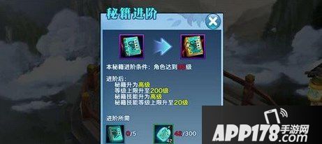 到达一定等级后,可以用五本秘籍和300门派信物将秘籍等级150级的中级秘籍进阶成高级秘籍。