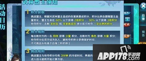 武林盟主不仅仅是个人的荣耀,更是集体的荣耀,家族凝聚力的象征,考验的是家族内是不是每个人都积极参与。独孤剑、南宫飞云、杨影枫三位武林盟主每天都等候少侠们的挑战。