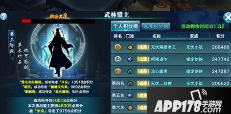 在一次武林盟主活动中,我们共有四次挑战盟主的机会,随着时间积分会从一倍到二倍,再到三倍。如果我们活动开始就挑战盟主,然后等时间冷却好了就再打,那样分数就会少很多,想打出最高的分数,重点在于打两次三倍,一次二倍,一次一倍。在游戏后期少侠们自身属性都非常出色,都可以坚持到武林盟主27秒时的清场。所以我们在倒计时7:30时打第二次、倒计时4:10时打第三次、然后不要去抢分,直接等时间冷却打第四次。这样就可以打出两次三倍,得到更多的积分。