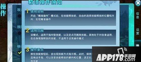 2、精准释放模式,适用于指向型技能,以及定点范围类技能。其他对人物本身使用,在自身周围释放的技能,不能使用精准释放模式释放技能。