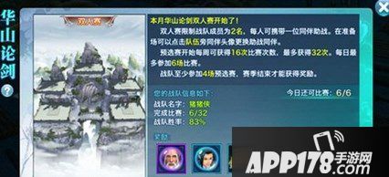 本次华山论剑采取双人PK的赛制。出战比赛时,每人可以携带一位同伴出场助战,在准备场的时候可以自由更换出场同伴。赛期内每天最多可以参加6次,每周最多16次。共计32场比赛,将对手主角和同伴全部击败的一方获胜,如果在规定时间没有击杀对方和同伴,就以战队的伤敌数、剩余同伴数量及输出的伤害值高低论输赢。最终按胜场次数、比赛时间、积分进行排名。