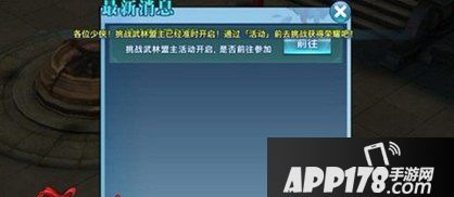 挑战武林盟主活动,是通过积分排名结算获得奖励的。每天的中午12:30和晚上7:30开启活动。游戏角色等级达到20级,加入一个家族后,即可参加这个活动。在活动页面中,日常活动一栏可以看到挑战武林盟主这个活动,这也是一个限时活动。活动开始前,系统会弹出活动开启的提示消息。点击前往,就可以开始挑战盟主了。