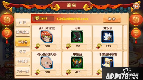 商店刷新:斗仙台商店固定于每日21:00刷新一次,主人们也可进行手动刷新,每次刷新需消耗10点荣誉值。