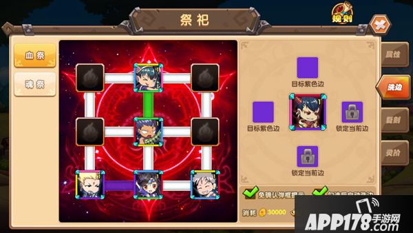 不同颜色的色边连接触发不同的增益效果,若是想要布出自己想要的祭祀阵法,对卡牌进行洗边是必不可少的。消耗铜钱可对不满意的色边进行重洗。