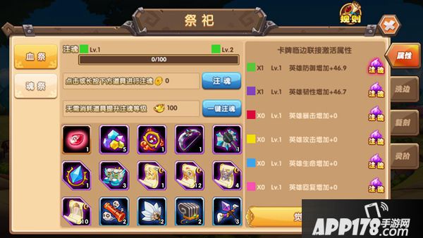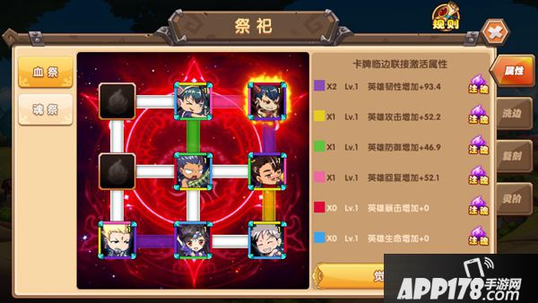 每一种祭祀的所产生的效果都不一样,血祭可以增加英雄的基础属性,魂祭主要是增加连击的伤害,而人鬼在英雄生命低至一定临界,可以降低来自敌方的伤害。不同的祭祀阵法还有着自己特殊的觉醒能力,可以更大幅度地提升基础属性。