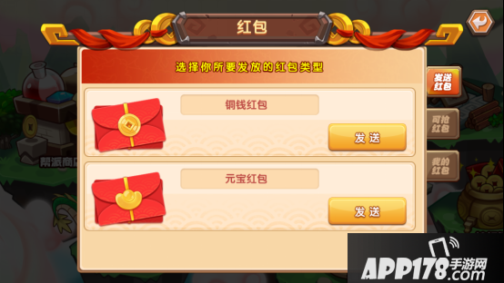 在红包系统里,你可以给帮派里面的小伙伴发铜钱红包,也可以壕气地发个元宝红包,这种好事情当然是多多益善啦~当然别人发红包的时候,千万不要眨眼睛!光速抢起!