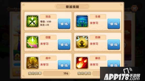 已解锁的技能可以修炼,这时候你在帮派供奉中获得的供奉值就派上用场了!帮派技能分为攻击、生命、回复、命中、暴击、韧性、闪避、防御,修炼获得属性加成会作用在所有英雄身上哦,所以千万别小看,赶快修炼起来吧~