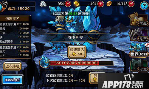 作为世界BOSS,这只冰川巨人既拥有超厚的血量,还拥有一项变态的群体必杀技能。这里所谓的必杀,可不只是一个夸张的说法,而是实实在在的击杀,不论你还有多少血量,不论你防御多高,也不论你还剩的英雄有几个,只要BOSS用了这招,那么你所有的英雄都会被强行秒杀,直接进入等待复活状态。当然,要让BOSS用出这招必杀技的前提得是你自身足够坚挺,能在BOSS手下坚持一定的时间。